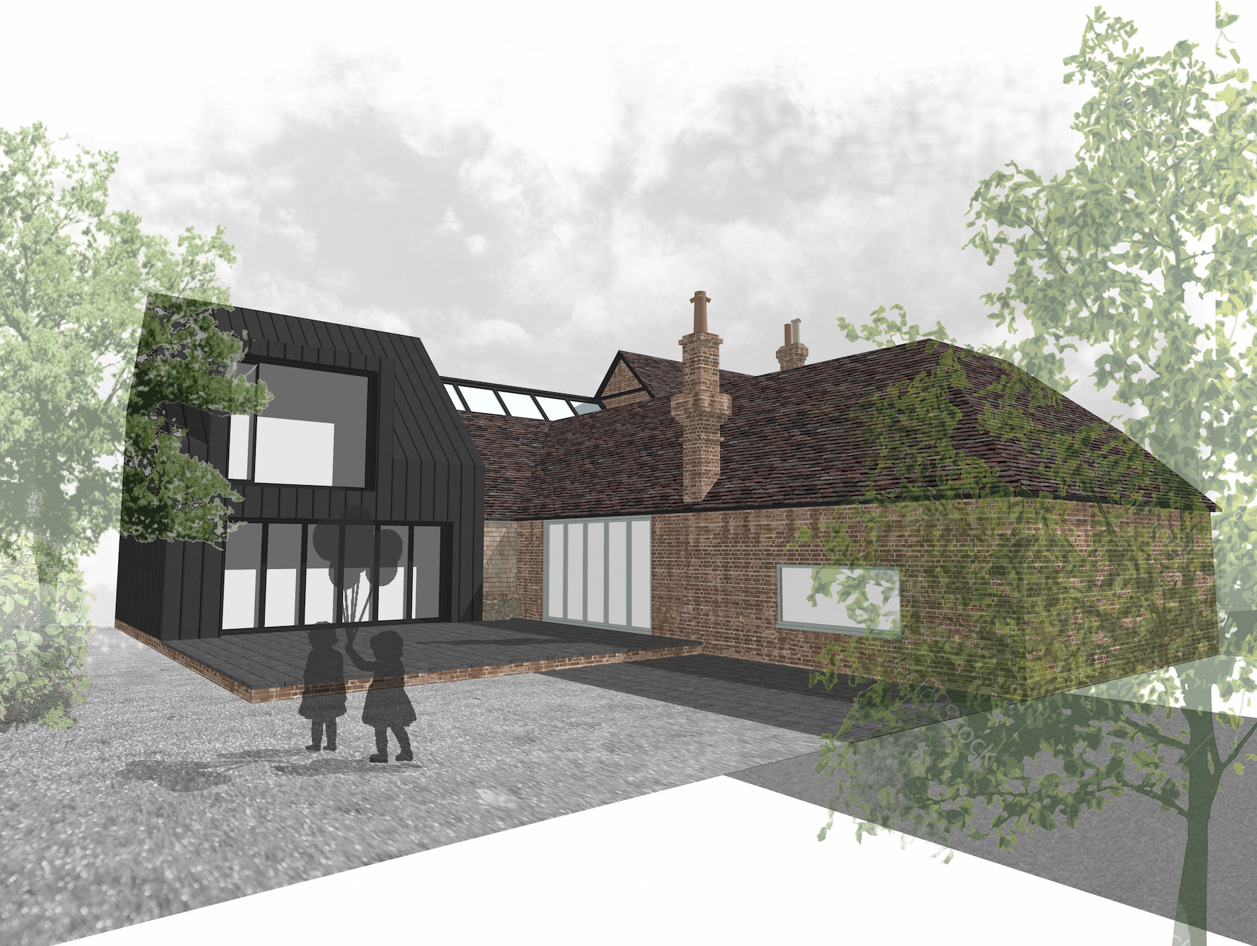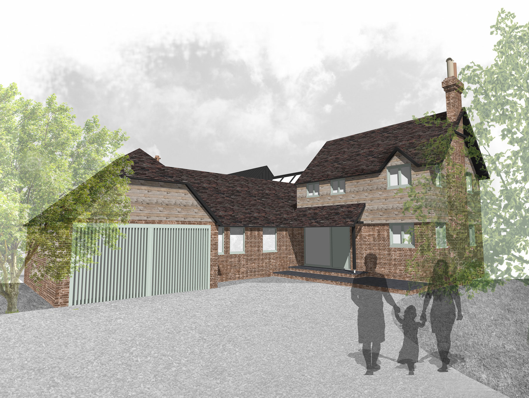 This small character cottage located on the outskirts of Winchester is to undergo a dramatic transformation, from a cramped 2 bedroom dwelling to a luxurious four bedroom family home. Incorporating an existing stable and double garage, the property is to be completely refurbished both inside & out, with open plan living spaces focused around beautifully landscaped gardens. The existing hung tile cladding to the front elevation is to be replaced with a more contemporary timber, and a new covered porch introduced, allowing the property to be modernized without losing its original rustic charm.